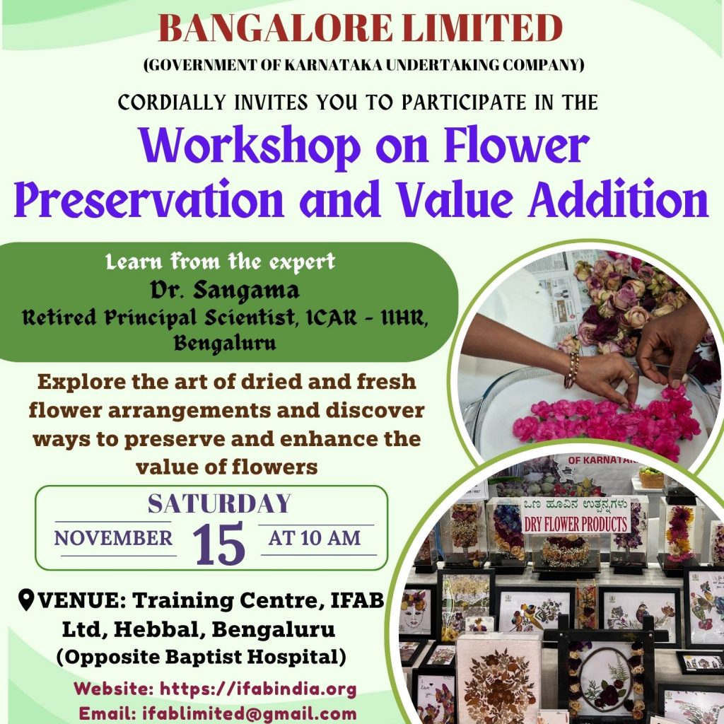 Workshop on Flower Preservation & Value Addition By IFAB Posted November 11, 2025 In Big Garden Workshop on Flower Preservation & Value Addition2025-11-112025-11-11https://ifabindia.org/wp-content/uploads/2019/05/logo.jpgIFAB-International Flower Auction Bangalorehttps://ifabindia.org/wp-content/uploads/2019/05/logo.jpg200px200px 0 IFAB Recent PostsLISIYANTHUS SPRING FESTIVAL 2025Wishing You All a Very Happy New Year 2025 Leave a Comment Cancel reply Save my name, email, and website in this browser for the next time I comment.
